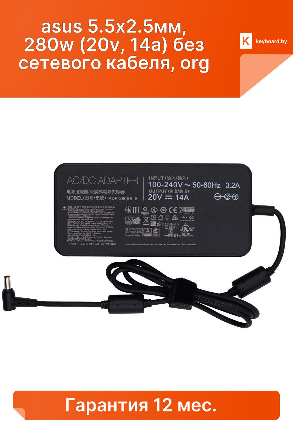 Блок питания asus 5.5x2.5мм, 280w (20v, 14a) без сетевого кабеля, org
