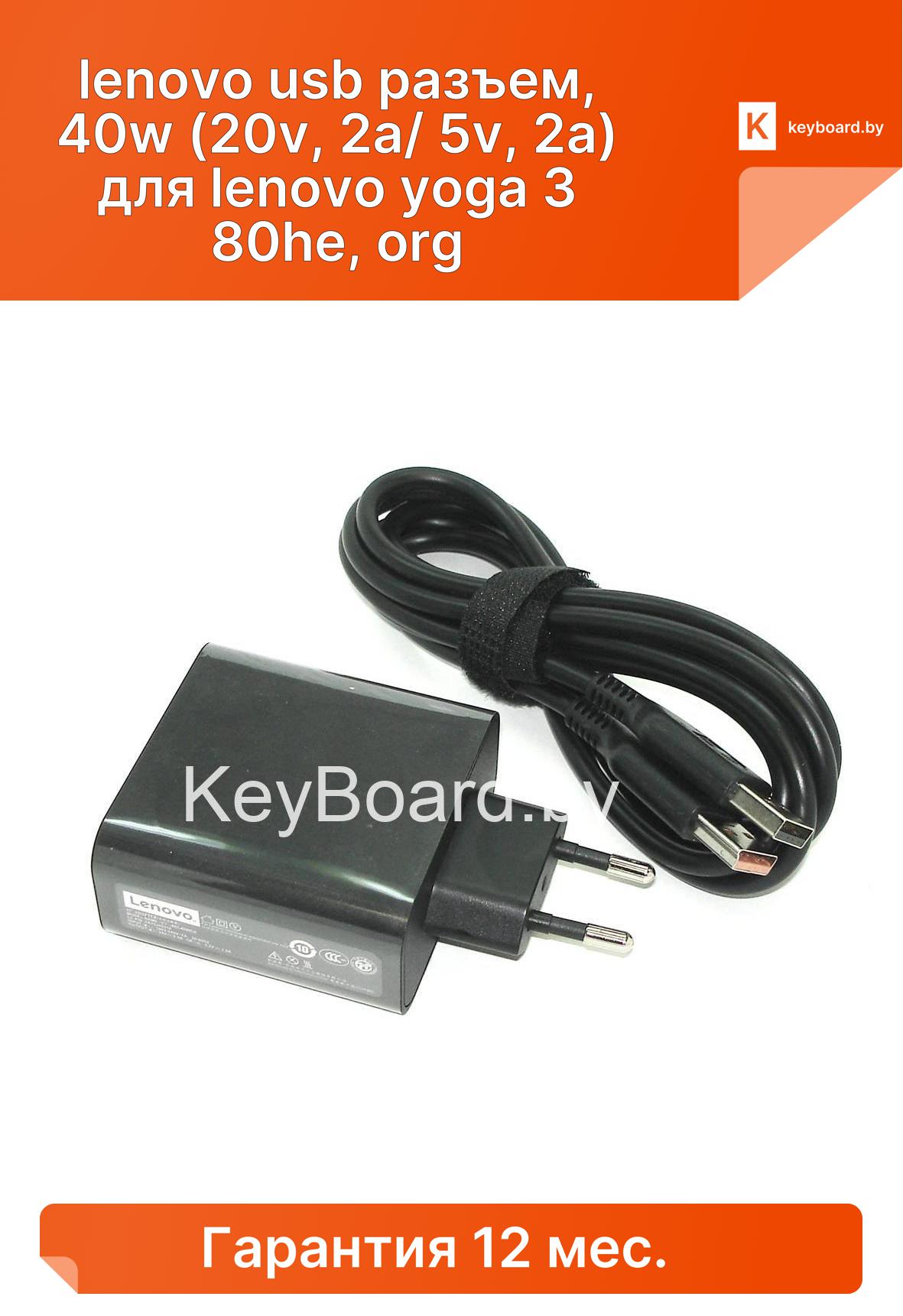 Блок питания lenovo usb разъем, 40w (20v, 2a/ 5v, 2a) для lenovo yoga 3 80he, org