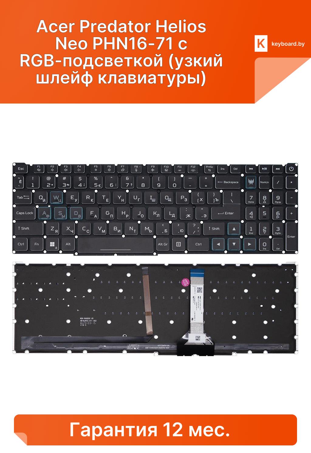 Клавиатура для ноутбука acer predator helios neo phn16-71 с rgb-подсветкой (узкий шлейф клавиатуры)