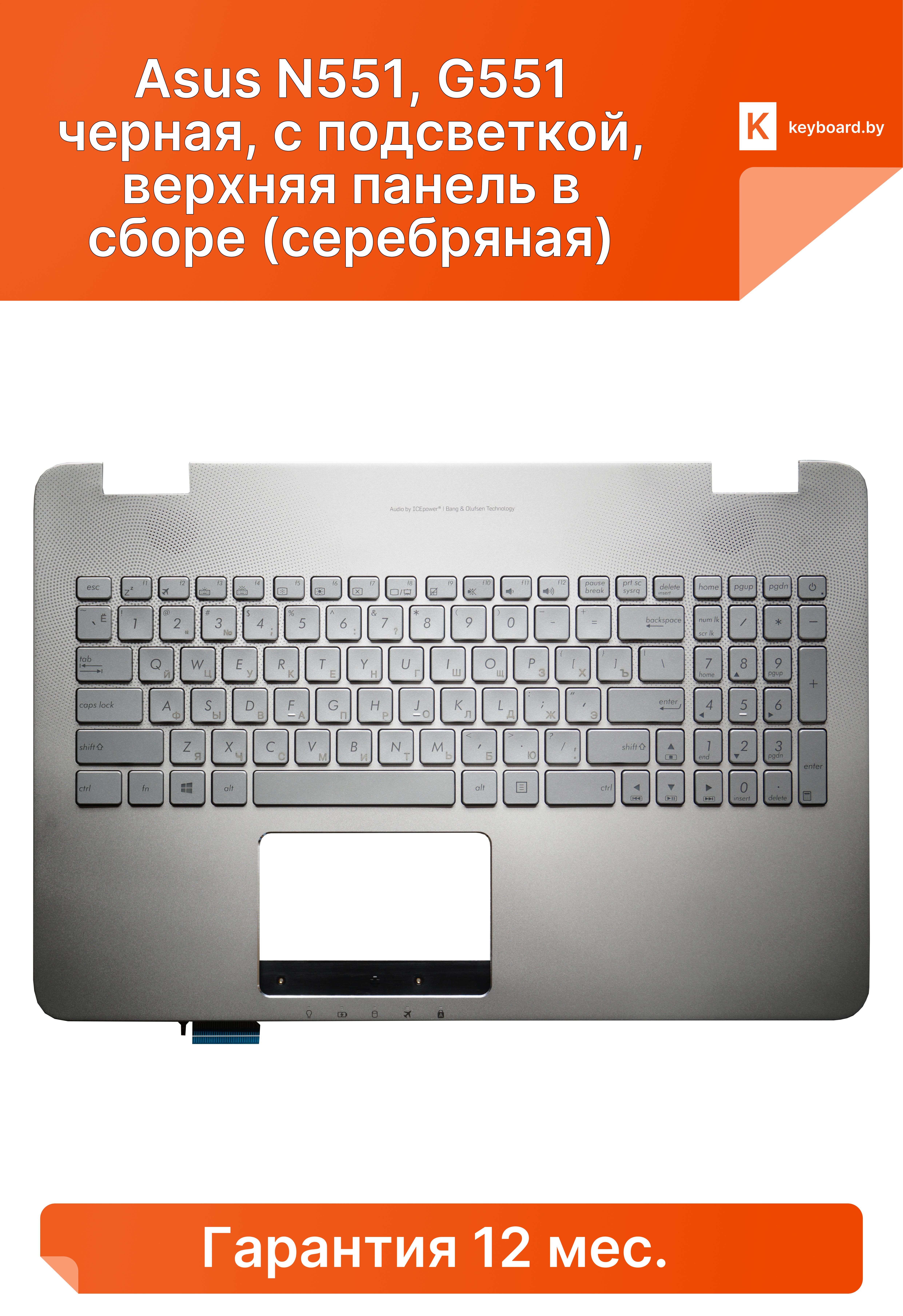 Клавиатура для ноутбука asus n551, g551 черная, с подсветкой, верхняя панель в сборе (серебряная)