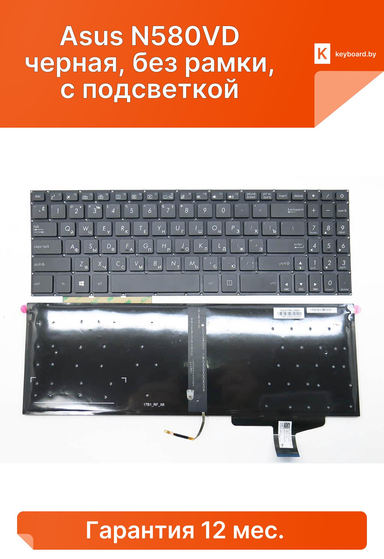 Клавиатура для ноутбука asus n580vd черная, без рамки, с подсветкой