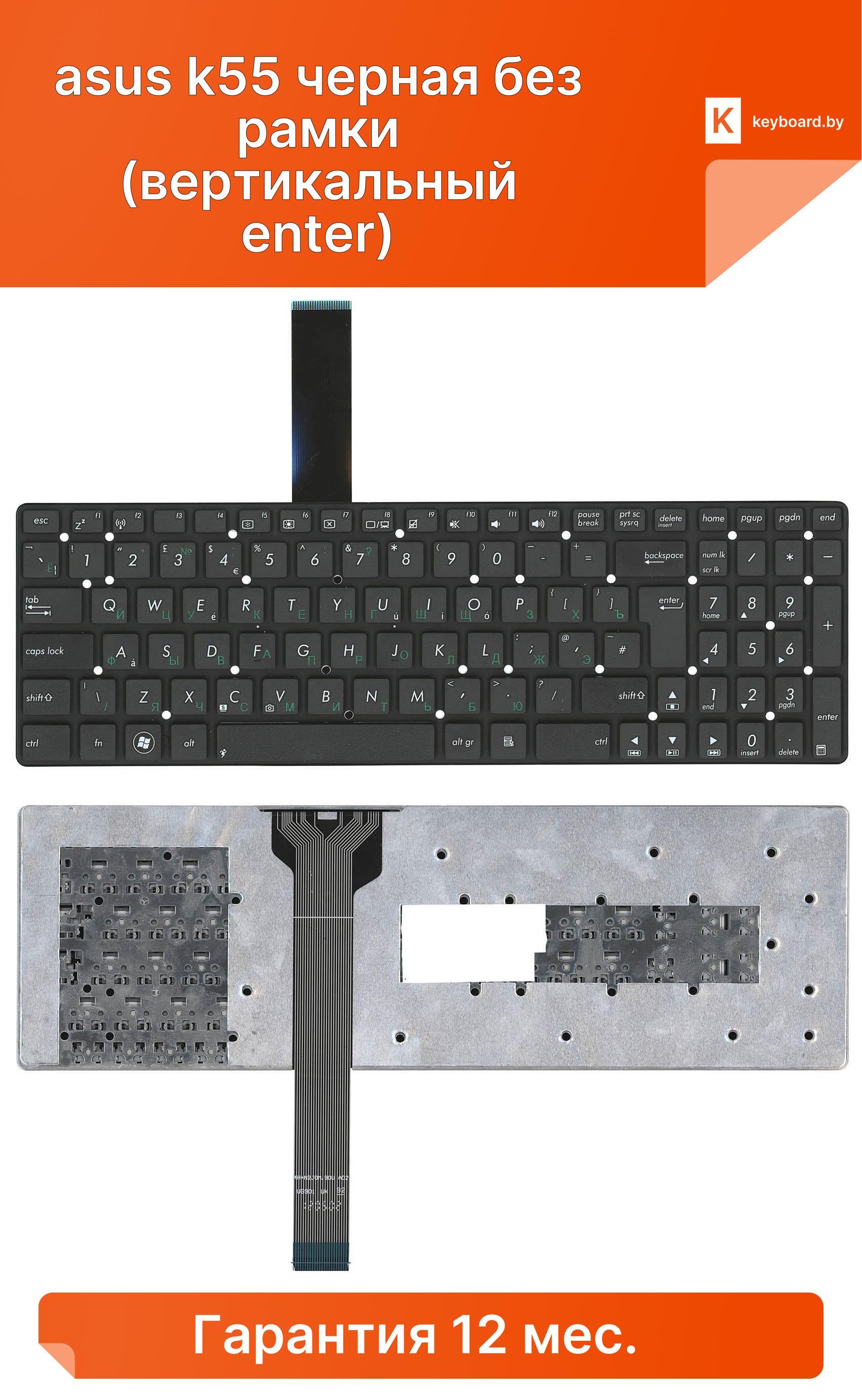 Клавиатура для ноутбука asus k55 черная без рамки (вертикальный enter)