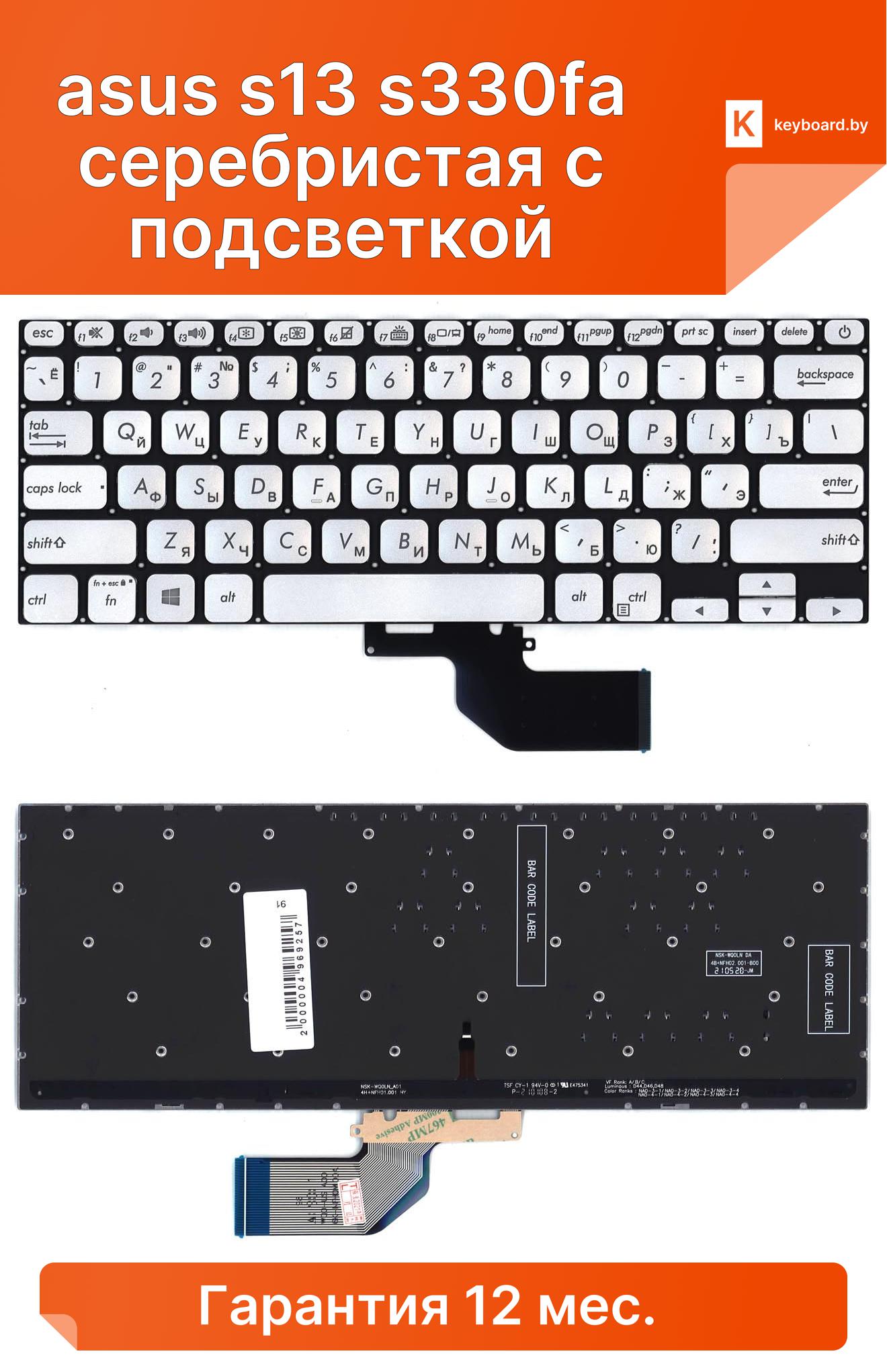 Клавиатура для ноутбука asus s13 s330fa серебристая с подсветкой