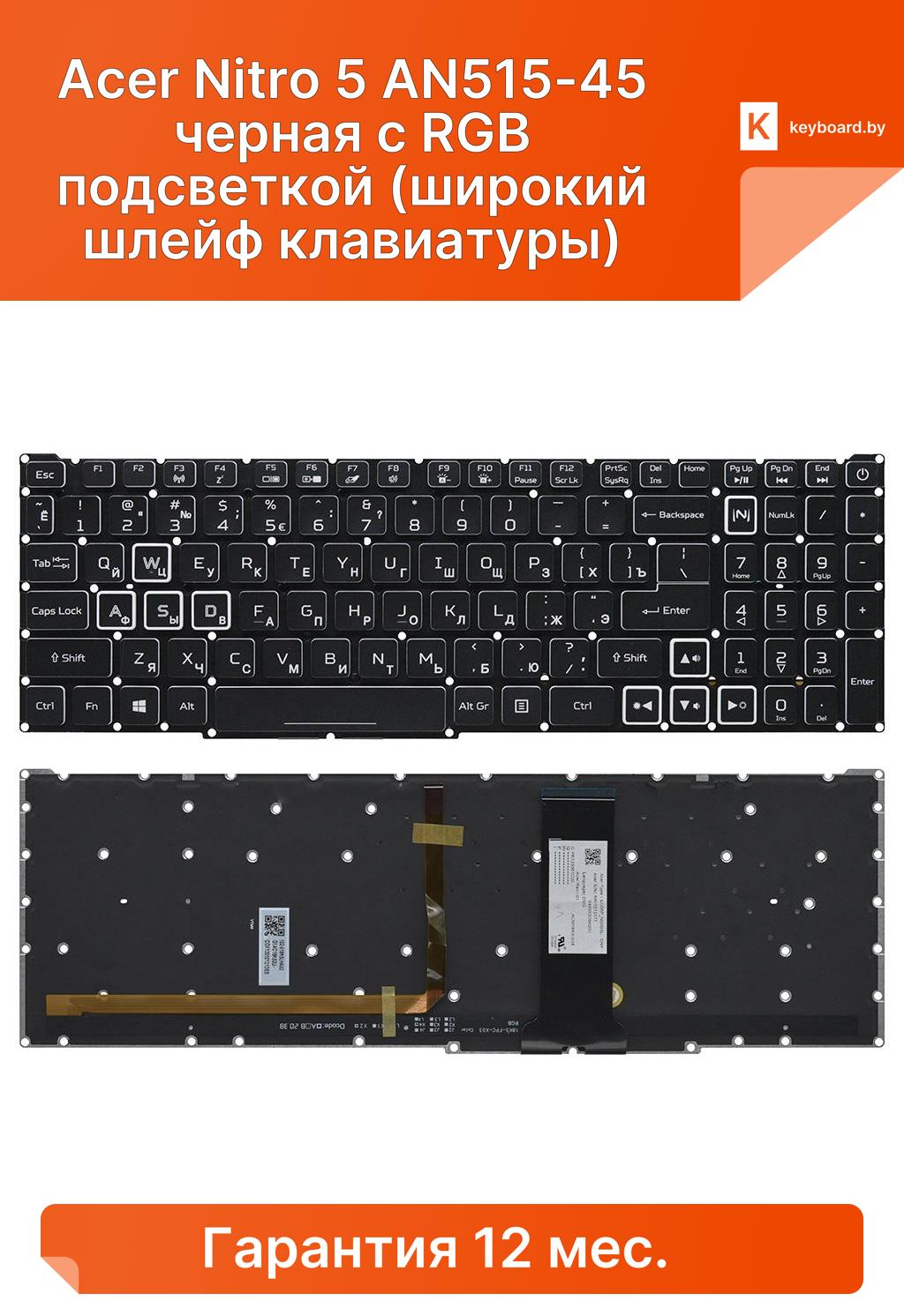 Клавиатура для ноутбука acer nitro 5 an515-45 черная с rgb подсветкой (широкий шлейф клавиатуры)